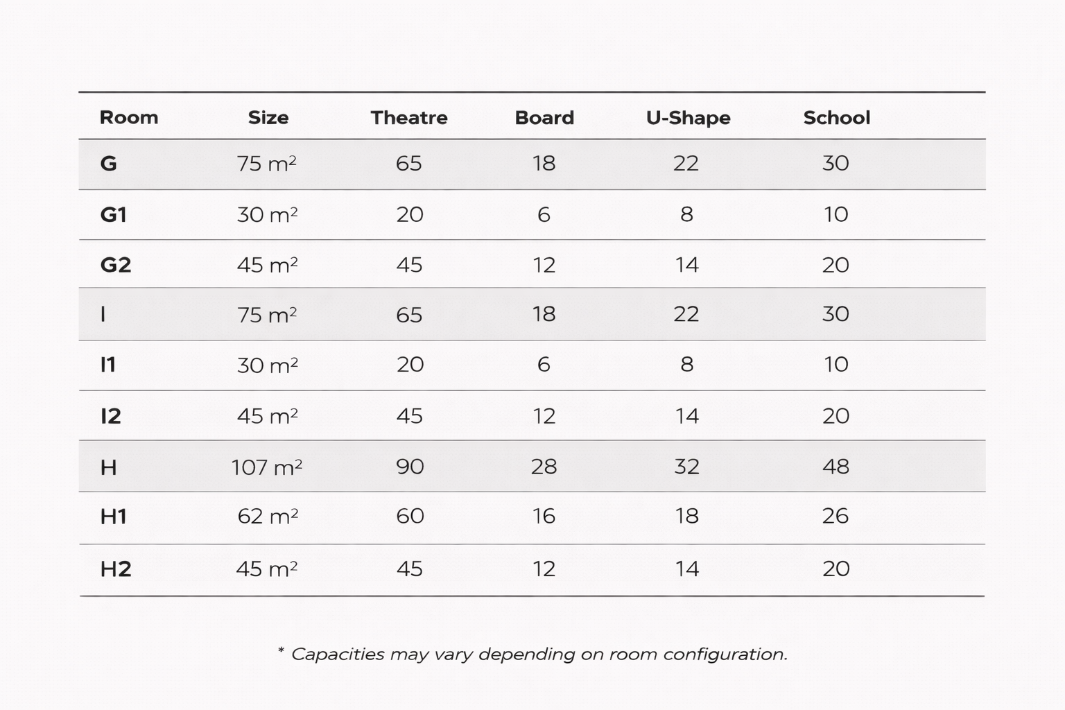 Modernes et élégantes, toutes les salles sont équipées d’un système audiovisuel de dernière génération, conçu pour favoriser la collaboration, l'innovation et l'efficacité.