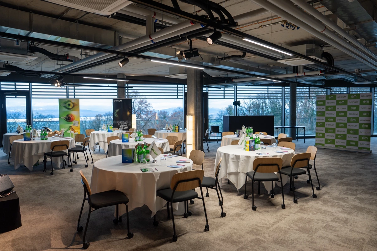 La salle Genève offre une salle de conférence lumineuse de 270 m2 disposant d'une vue panoramique sur le lac Léman, le Mont-Blanc et la campagne environnante.